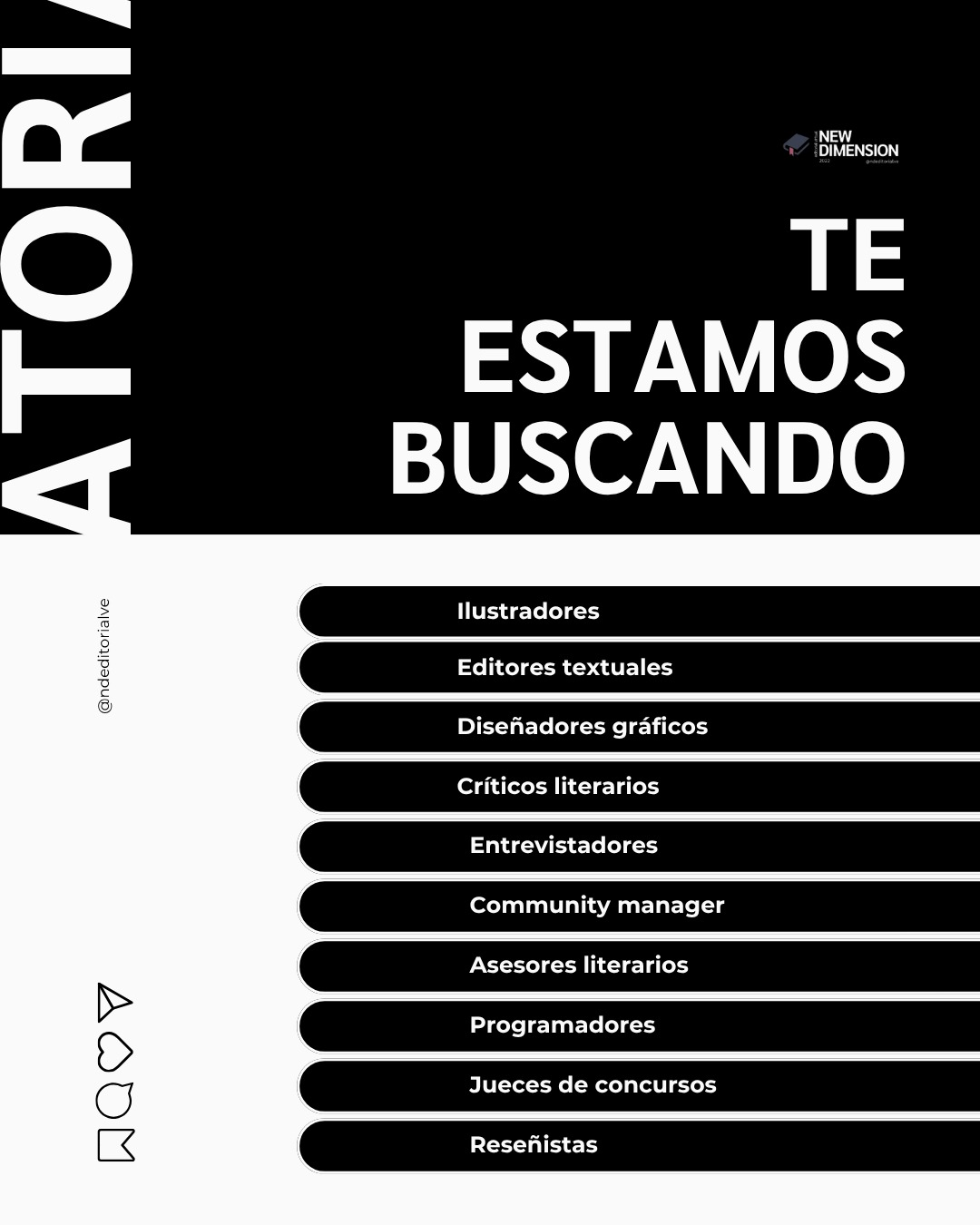 Desde su fundación, New Dimension ha dado prioridad al acompañamiento de autores emergentes, la profesionalización del proceso editorial y la creación de espacios donde el talento literario pueda expresarse sin restricciones. Hoy, reafirmando su espíritu colaborativo, lanza una invitación pública para postularse como parte de su equipo de trabajo, dirigida a todas aquellas personas apasionadas por el universo del libro.
